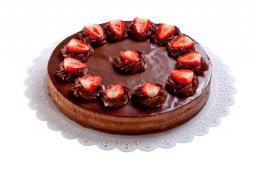 Massa base biscoito de chocolate, creme de chocolate, creme trufado e morango